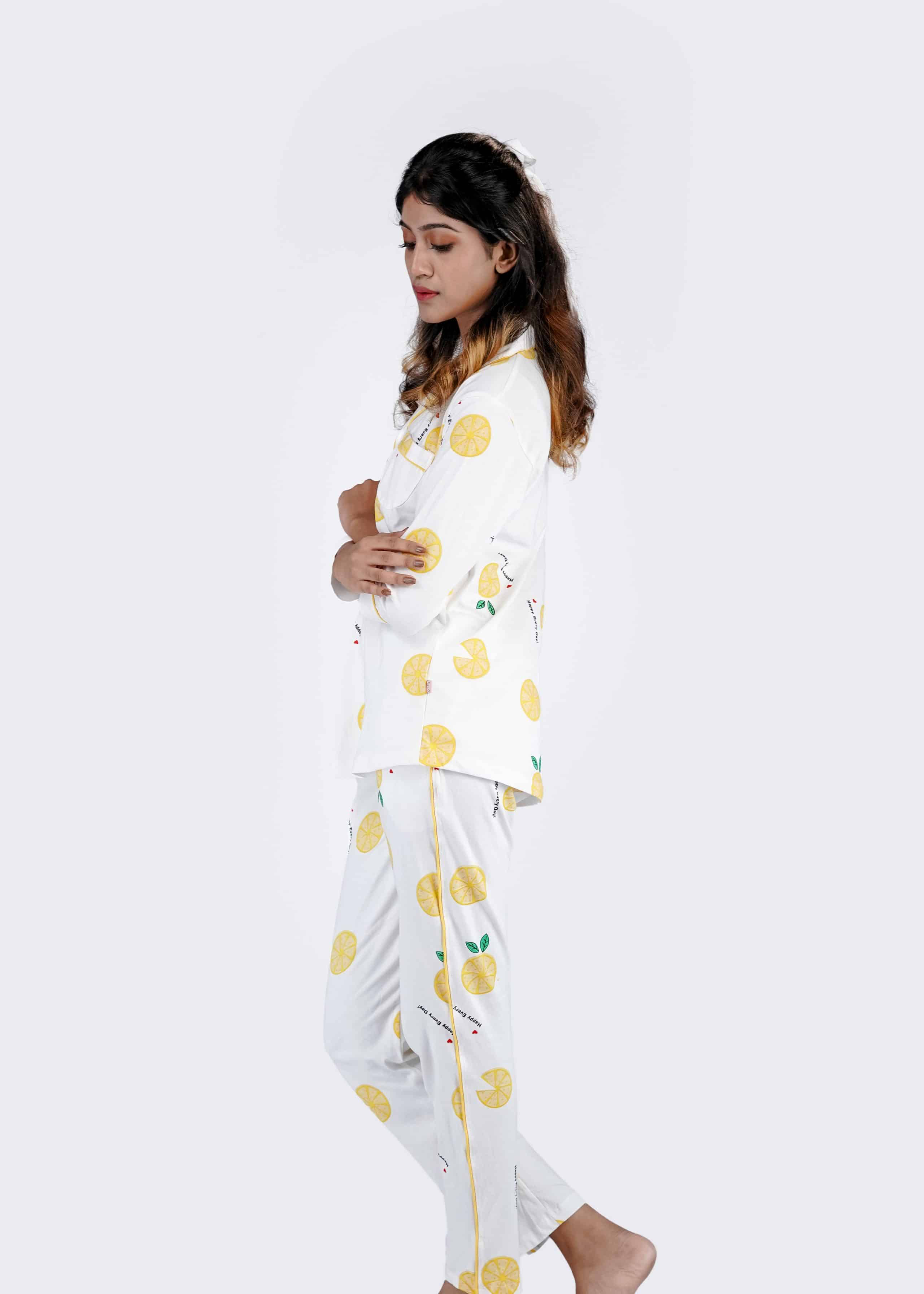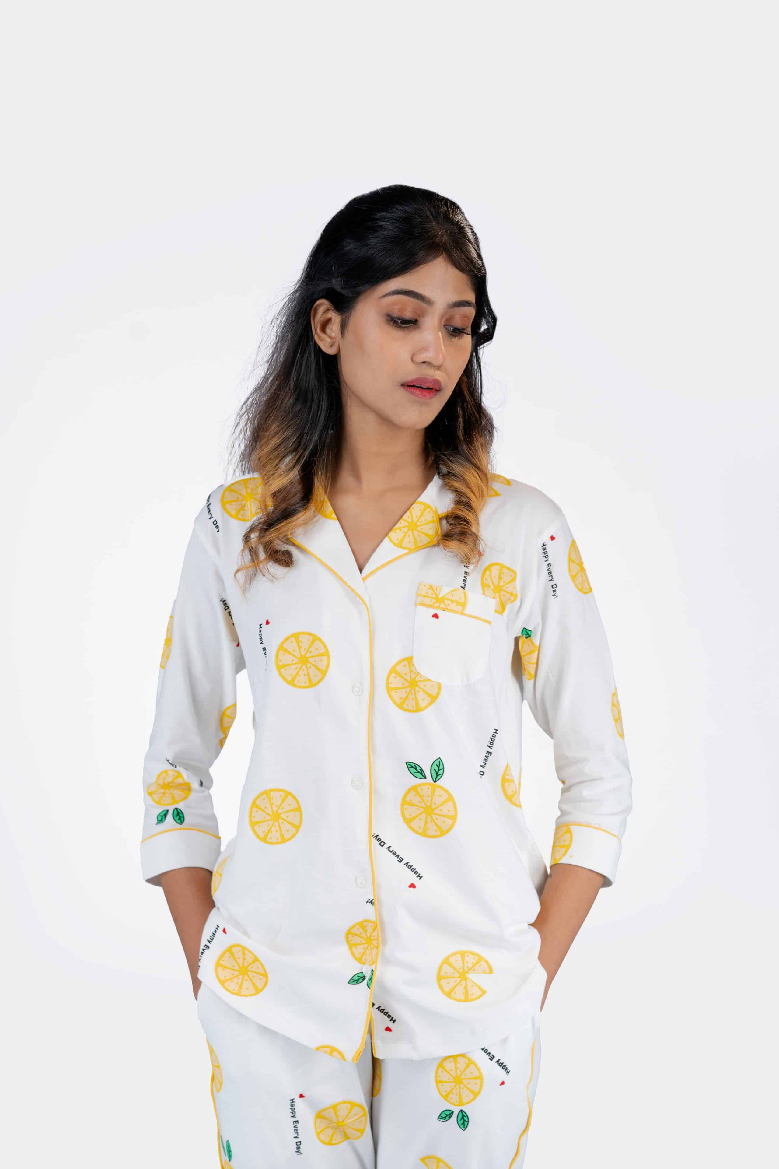 Leafy Mandarin White Pyjama set | Notched Collor | 100% Pure Cotton | Bio-Washed | Manufacture to Consumer Direct sale